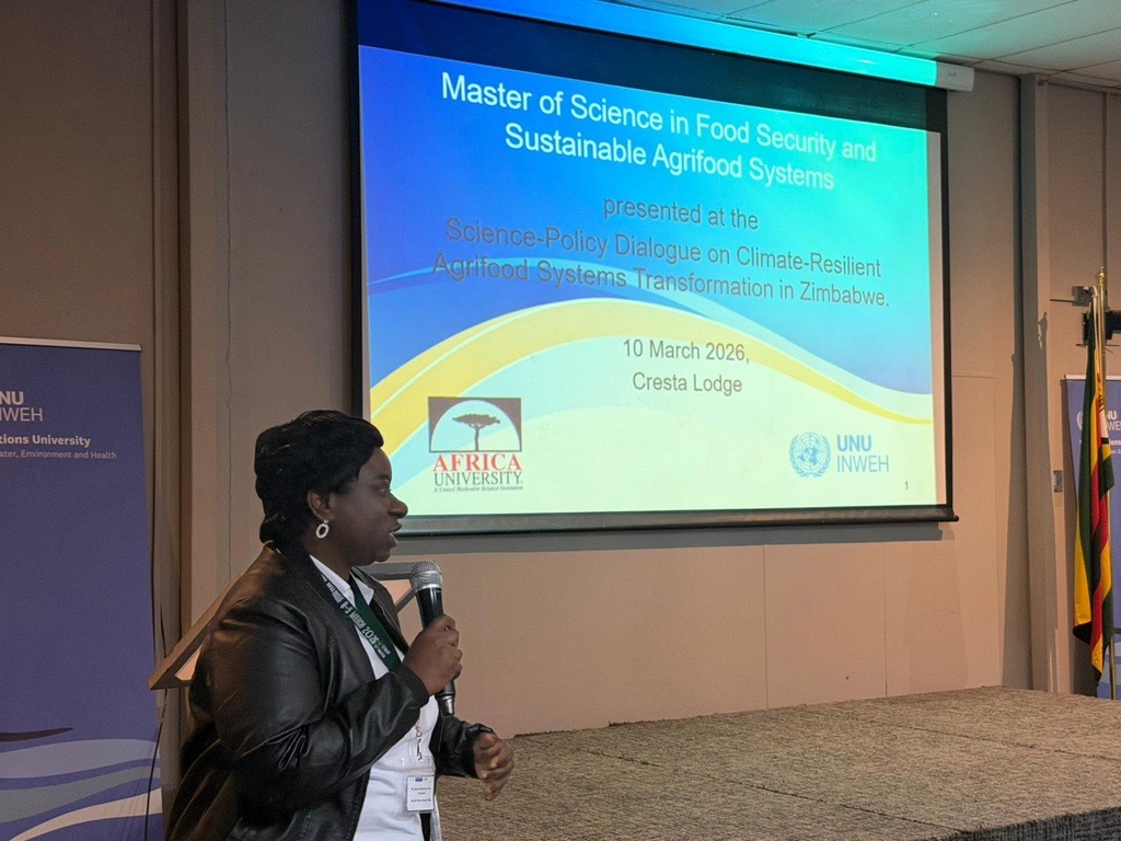 Dr. Denice Chikwanda, Head of the Department of Agriculture and Environmental Sciences at Africa University presents on the joint Master of Science developed with UNU-INWEH on Food Security and Sustainable Agrifood Systems.