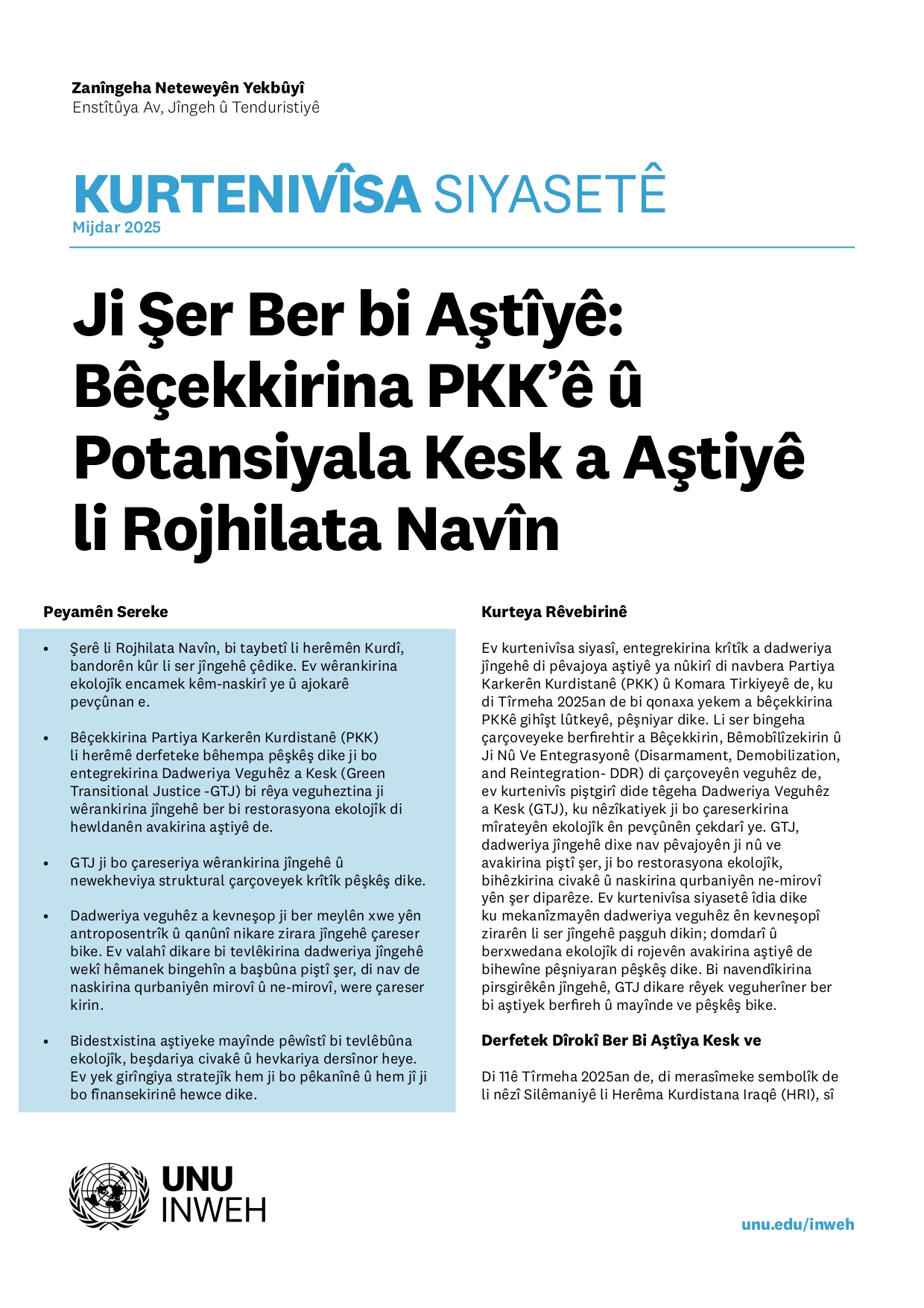 UNU-INWEH Kurtenivîsa Siyasetê: Dinç, P., Eklund, L., Matin, M., Madani, K. (2025). Ji Şer Ber Bi Aştiyê Ve: Bêçekkirina PKKê û Potansiyela Kesk Ji Bo Aştiyê Li Rojhilata Navîn. Zanîngeha Neteweyên Yekbûyî Enstîtûya Av, Jîngeh û Tenduristiyê (UNU-INWEH), Richmond Hill, Ontario, Kanada. doi: 10.53328/INR25PDR003
