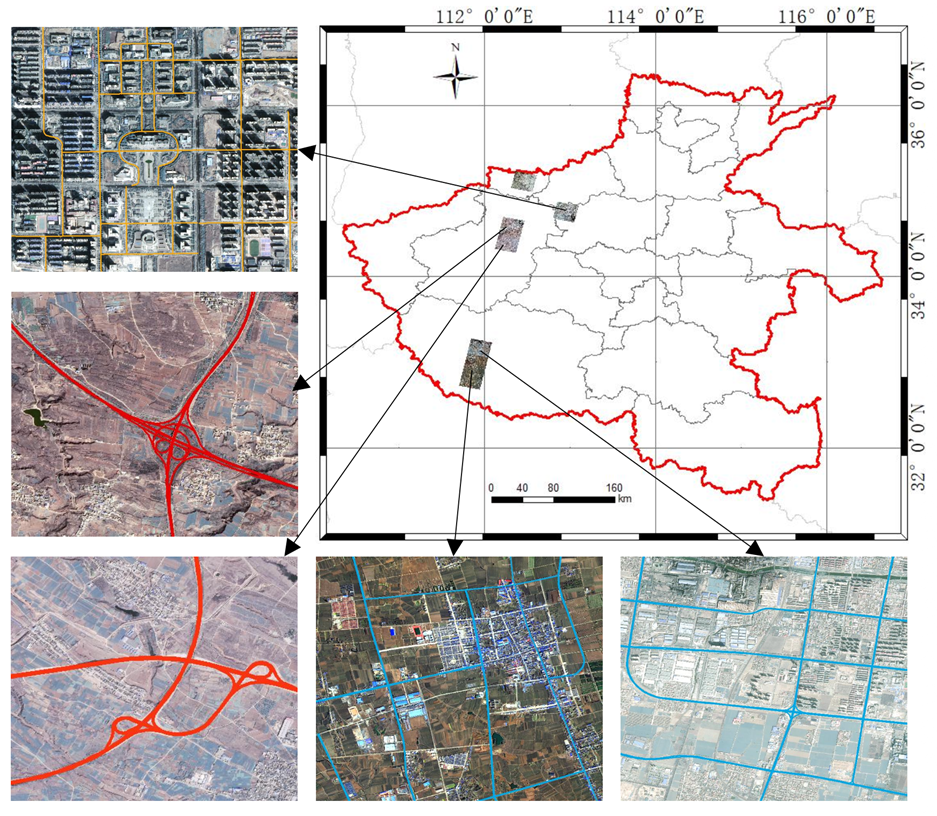 SYSU-HiRoads is derived from GF 2 satellite imagery covering Henan Province, China, with a spatial resolution of 0.8 meters. It spans approximately 3,631 square kilometres and contains 1,079 image tiles, each sized 1024 by 1024 pixels. As shown in Figure 1, the dataset covers a substantial geographic area across Henan Province, providing a broad empirical basis for road extraction and classification research.