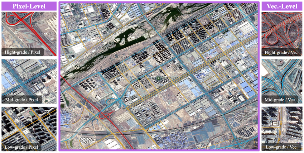 Yet there is a crucial gap evident in that many existing road datasets often support only part of the problem: some are designed to detect where roads are located in an image (binary road segmentation), while others are better suited to reconstructing how roads connect into a network (network reconstruction through centerlines). Fewer datasets bring these elements together with labels that distinguish different types of roads, such as major roads, secondary roads, and local roads, in one aligned resource. This makes it difficult for researchers to study road surfaces, network structure, and road hierarchy within a single benchmark. The challenge is particularly relevant in China, where openly accessible, high quality benchmark datasets for this kind of fine grained road analysis remain relatively limited.